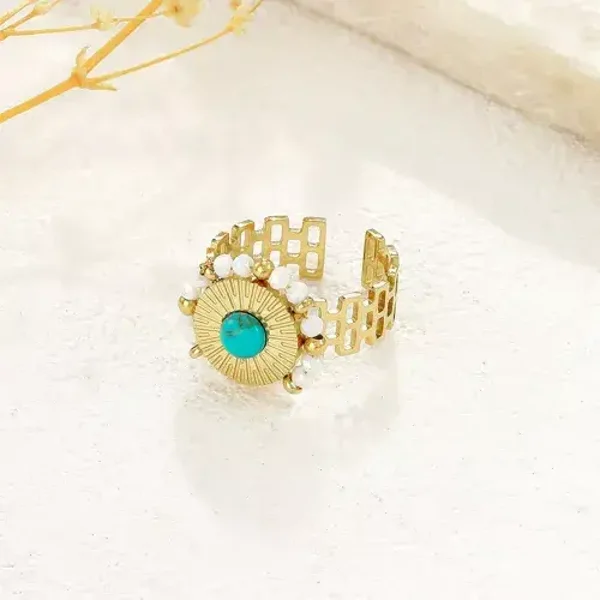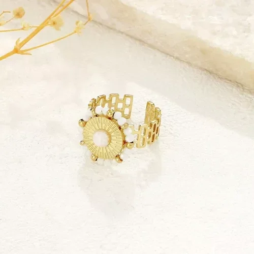 Sublimez vos mains avec cette bague dorée ajustable au motif solaire élégant, ornée d’une pierre et de délicates perles blanches.