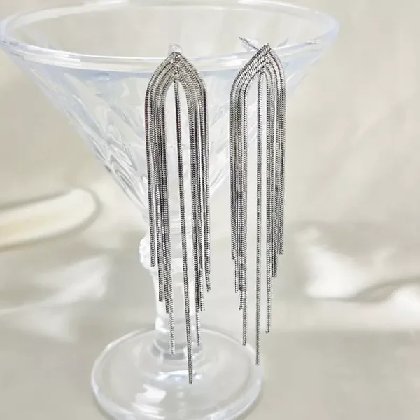 Apportez une touche sophistiquée à votre look avec ces boucles d’oreilles argentées à chaînes longues, au design fluide et moderne. Parfaites pour sublimer une tenue de soirée ou apporter une note chic à votre style quotidien.