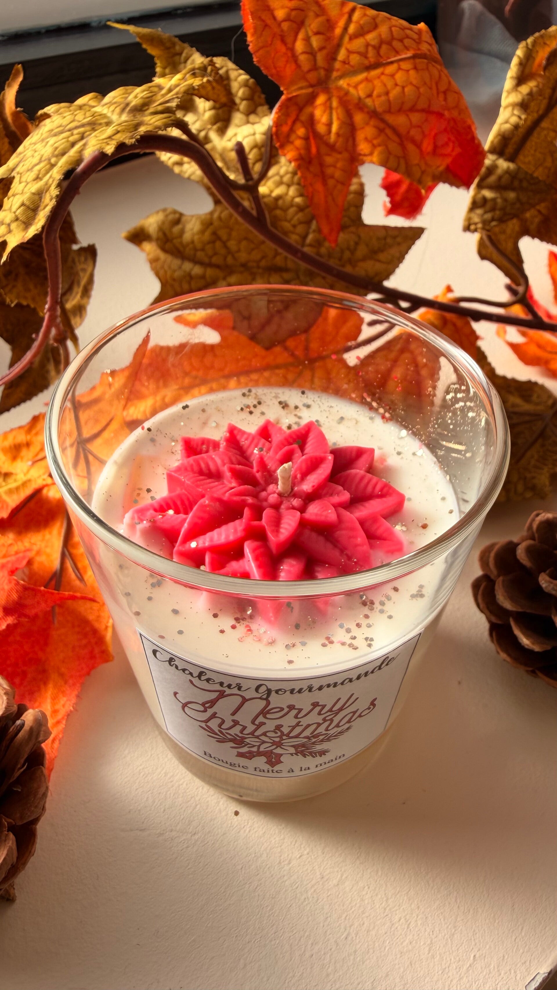 Chaque bougie est coulée à la main avec une cire de soja 100 % naturelle et ornée d’une fleur rouge en cire, rappelant les poinsettias de Noël 🌺